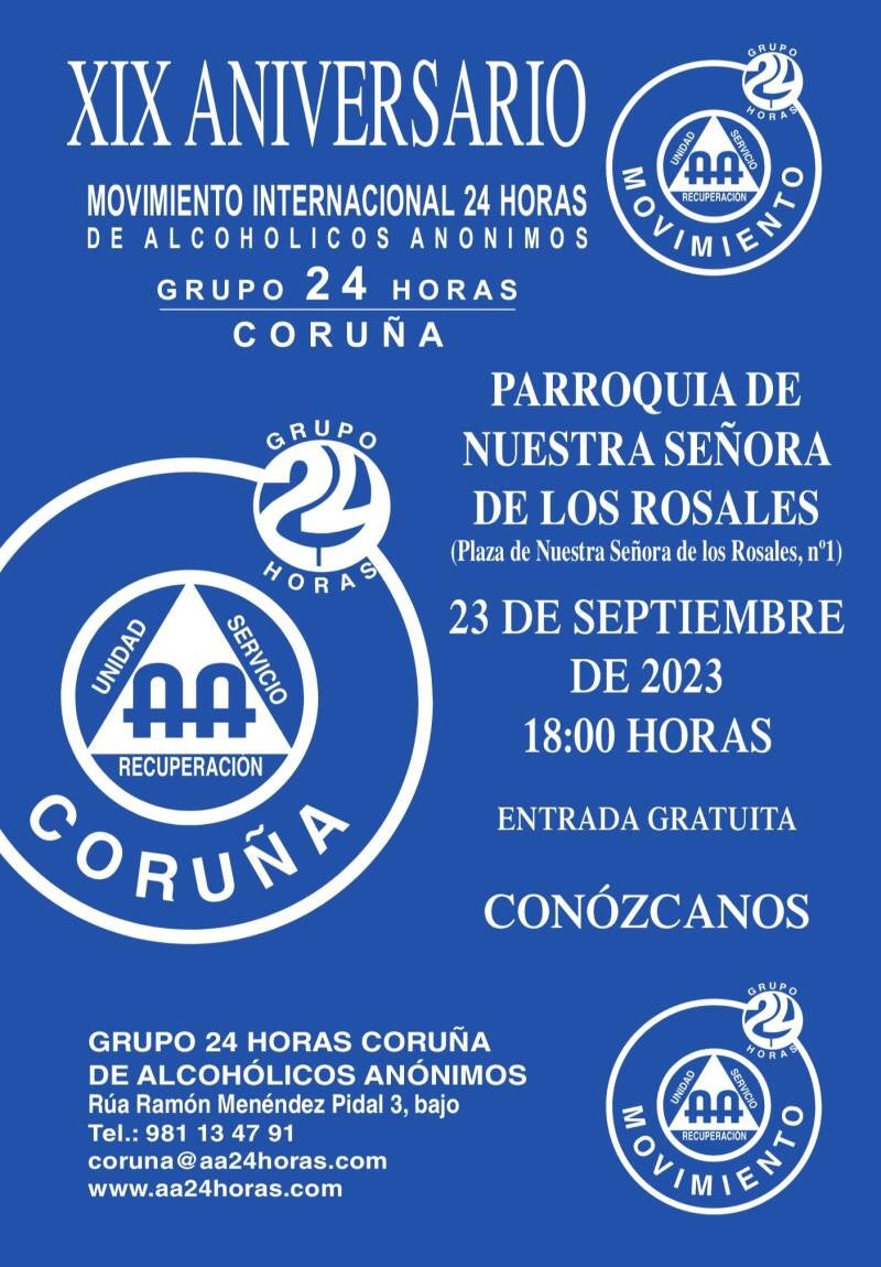 Os anunciamos que el sábado, día 23, en el salón parroquial, se celebrará un ENCUENTRO de celebración e información del grupo ALCOHÓLICOS 24 HORAS, con sede también en la ciudad.