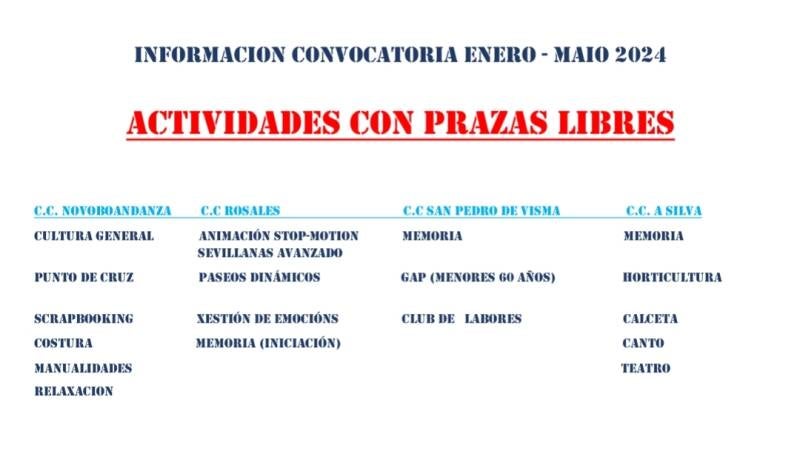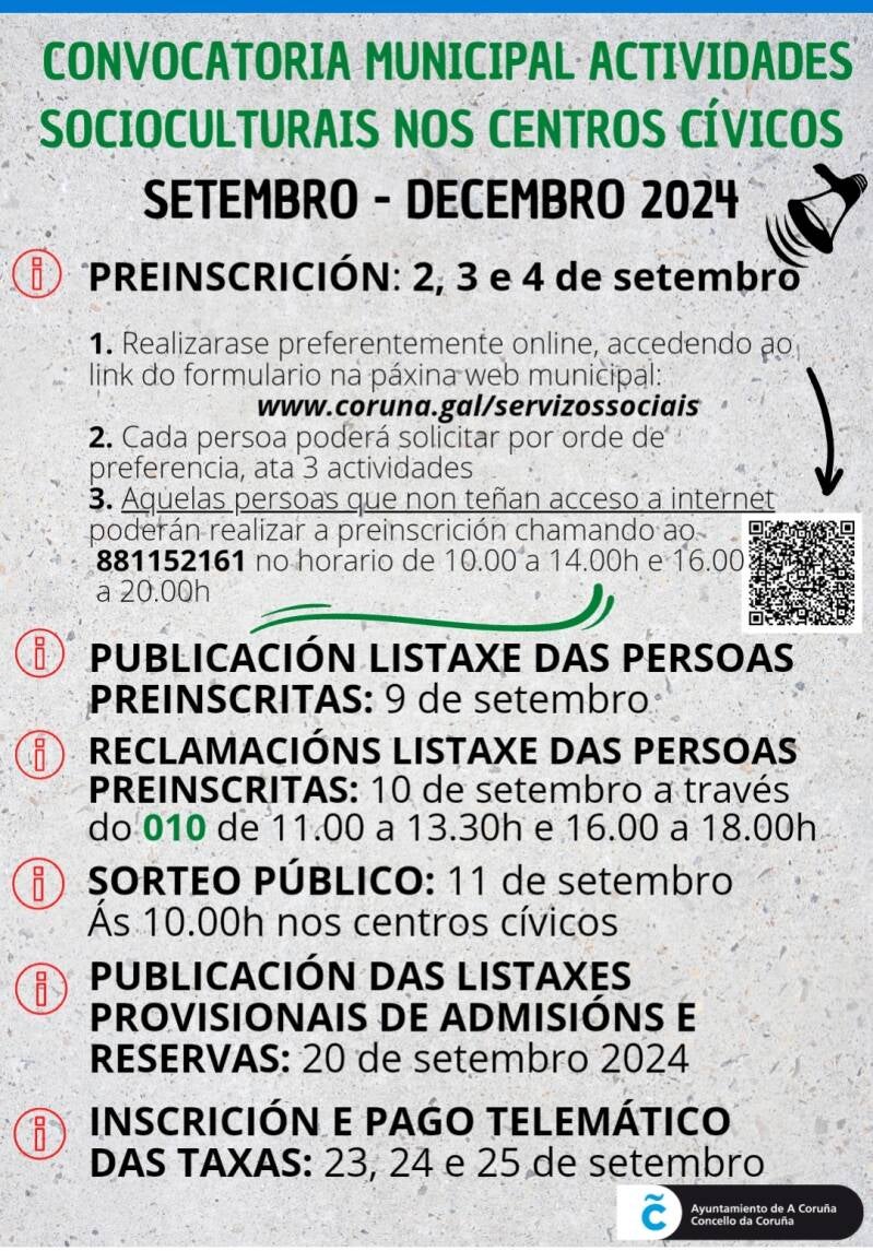 Enviamos cartel informativo e enlace web da convocatoria de actividades socioculturais, nos centros cívicos do Concello da Coruña, para o período de xaneiro a maio de 2024.